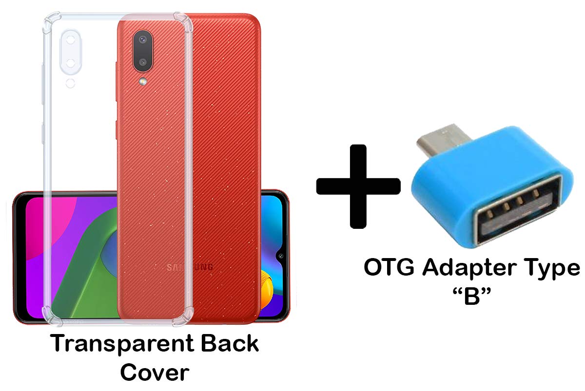 - Transparent 4 Corner Cution Technology Case For Samsung Galaxy M02 Clear Protection Case With Free TYPE B OTG Adapter