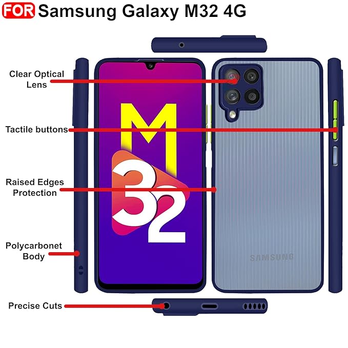 - Looks : The Shockproof cover for Samsung Galaxy M32/F22 provides elegant look to your phone the back side of the cover is Translucent which protect your phone from scratches where as the raised sides protect it from falls.